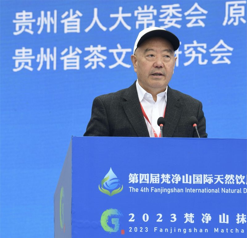 省人大常委会原副主任、省茶文化研究会会长傅传耀在致辞中讲到,梵山净土,碧水清泉,绿茶浪翻。抹茶原料生长在这样的环境,采天地之灵气,集大地之精华,干净是其基本要求,若论生态环境,抹茶之都非铜仁莫属。抹茶占天时,适地利,修人和,必将在中国式现代化道路上阔步前进,一往无前。