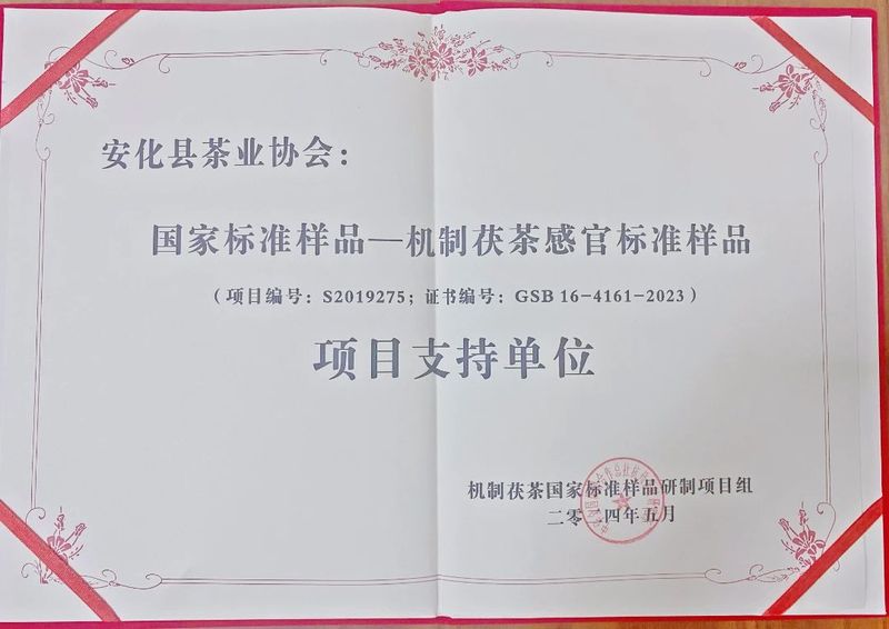 机制茯茶国家标准样品研制项目自2019年11月正式启动以来,安化县茶业协会及会员单位积极配合样品抽取、原料征集、茶砖压制、审评定值等各项研制工作。在中华全国供销合作总社杭州茶叶研究所的牵头领导下,在有关单位的配合支持及项目组的共同努力下,机制茯茶国家标准样品于2023年12月批准发布,于2024年5月23日正式启用。该样品科学、实用,代表性强,具有指导生产、控制产品质量和规范感官品质评价等功能。